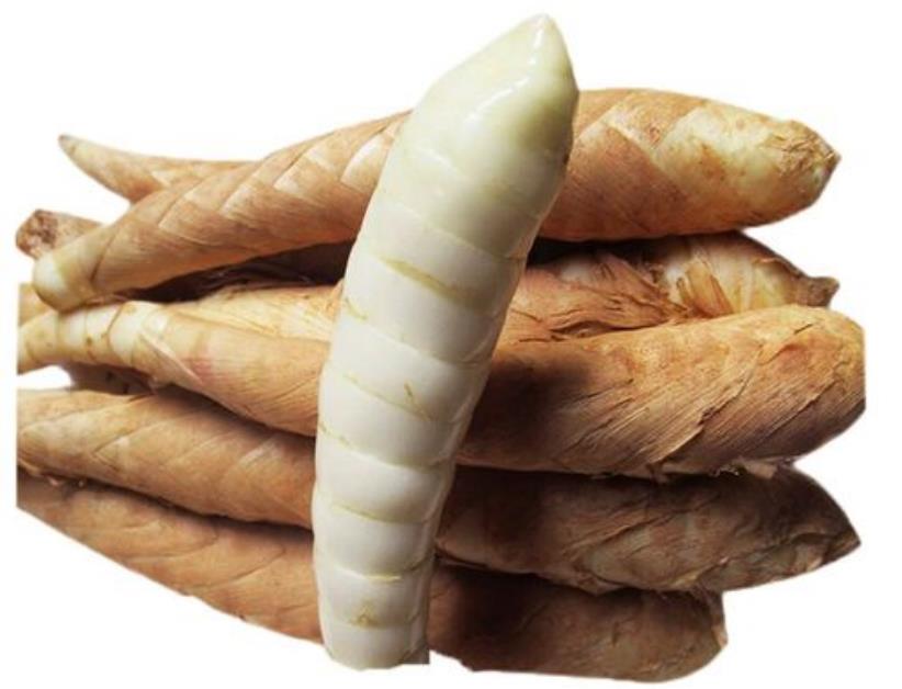 冬粉薯属于竹芋科植物,形状比较细长,里面的是雪白透亮的冬粉薯,外壳像冬笋,但没有冬笋粗壮。