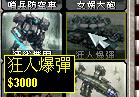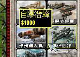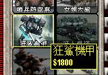 狂人爆弹:造价-3000。超级兵器(唯一)。重型装甲。武器:究极M.A.D.弹头。在部署后驾驶员会启动弹头爆破并且逃离驾驶室。爆炸后发出恐怖的超级爆破效果毁灭一切地面单位。在没有部署时爆炸不会产生效果。在战场上遇见它唯一要做的就是集中所有火力摧毁这个怪兽。