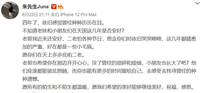 在6月22日,朱哥哥写道:四年了,依旧感觉曾经种种历历在目……