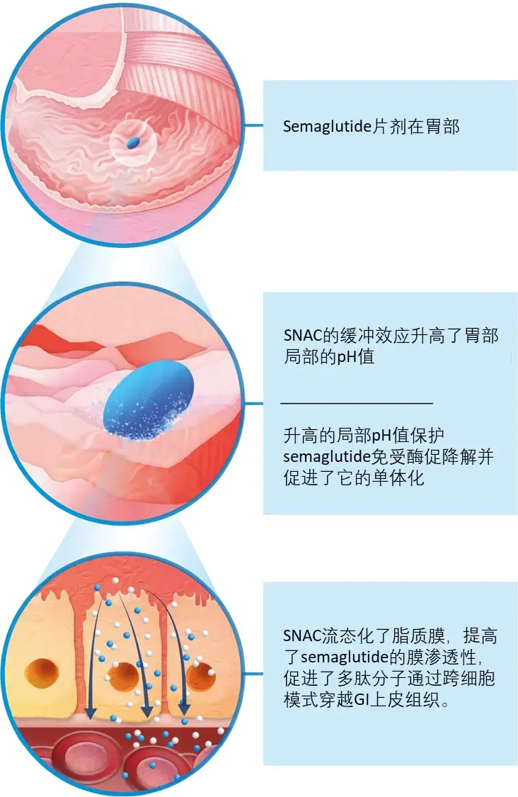 口服司美格鲁肽在胃内完全吸收,SNAC促进司美格鲁肽吸收的机制包括:SNAC促进司美格鲁肽单体化,增强渗透性;SNAC具有亲脂性,可有效插入到胃上皮细胞膜,改变胆固醇磷脂和蛋白质完整性,影响细胞膜流动性;SNAC有效增加司美格鲁肽分子周围局部pH值,阻止胃蛋白酶降解多肽,在细胞膜表面借助浓度梯度使司美格鲁肽穿透胃黏膜后吸收入血。