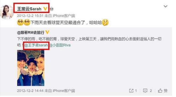 更显实锤的是,2012年有人发微博@王予柔Sarah,而王棠云Sarah进行了转发。恰巧,英文名完全相同。