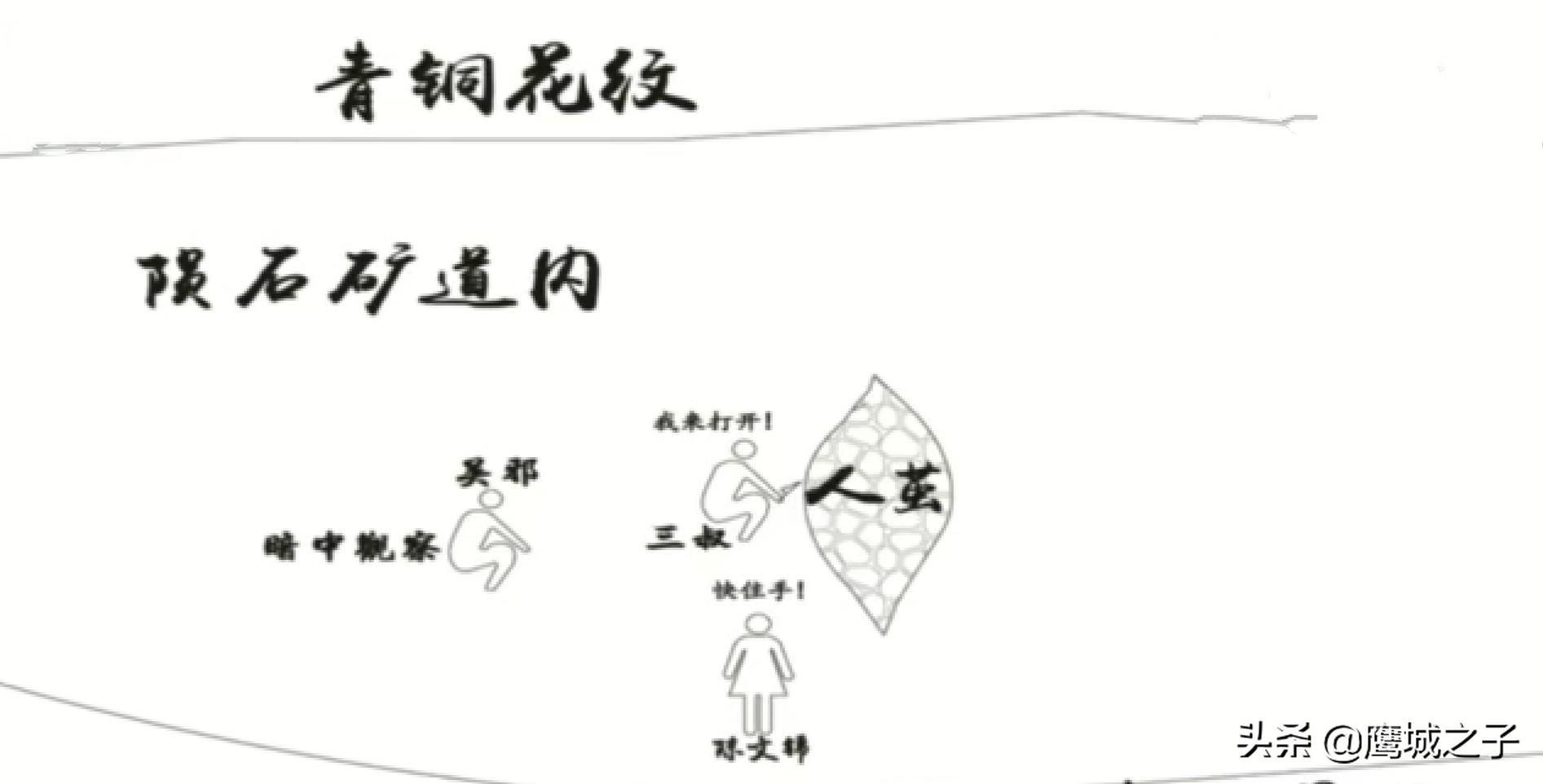 在陨石中初步估计应该睡了有4000年之久,三叔掏出了匕首,似乎想割开这个件,陈文锦按住了他,这个茧的年份和青铜门的年份是同一个时代的,陈文锦带着三叔去看四周的洞壁,在洞壁上画着很多花纹和青铜门是一样的,这茧里的人就是最开始建立青铜门的那些人,都沉睡在这块巨大的陨石里。这些人来的比西王母还早,之后,西王母在这里建国,使用了这些人遗留下来的技术,建立了巨大的西王母国,成为了丝绸之路上最神秘的古国。