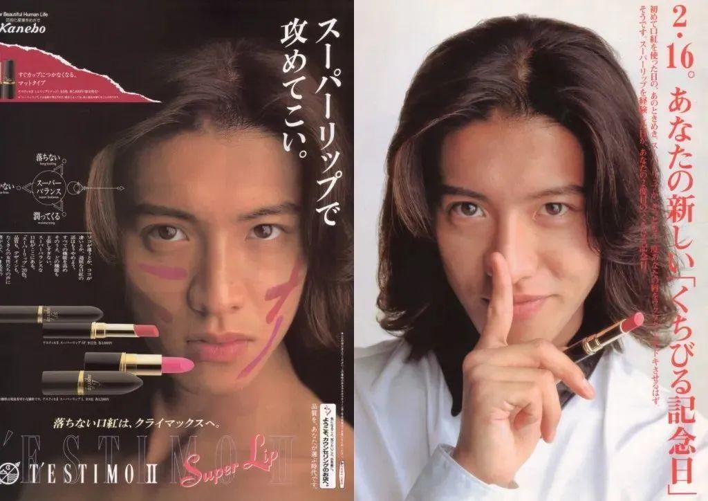 最典型的一个案例就是木村拓哉在1995年给口红拍的一个广告,其眼神柔媚,动作性感阴柔,立马就引爆了日本女性市场,在那个信息相对闭塞的年代,这款口红面世仅仅两个月就卖出了300万支。