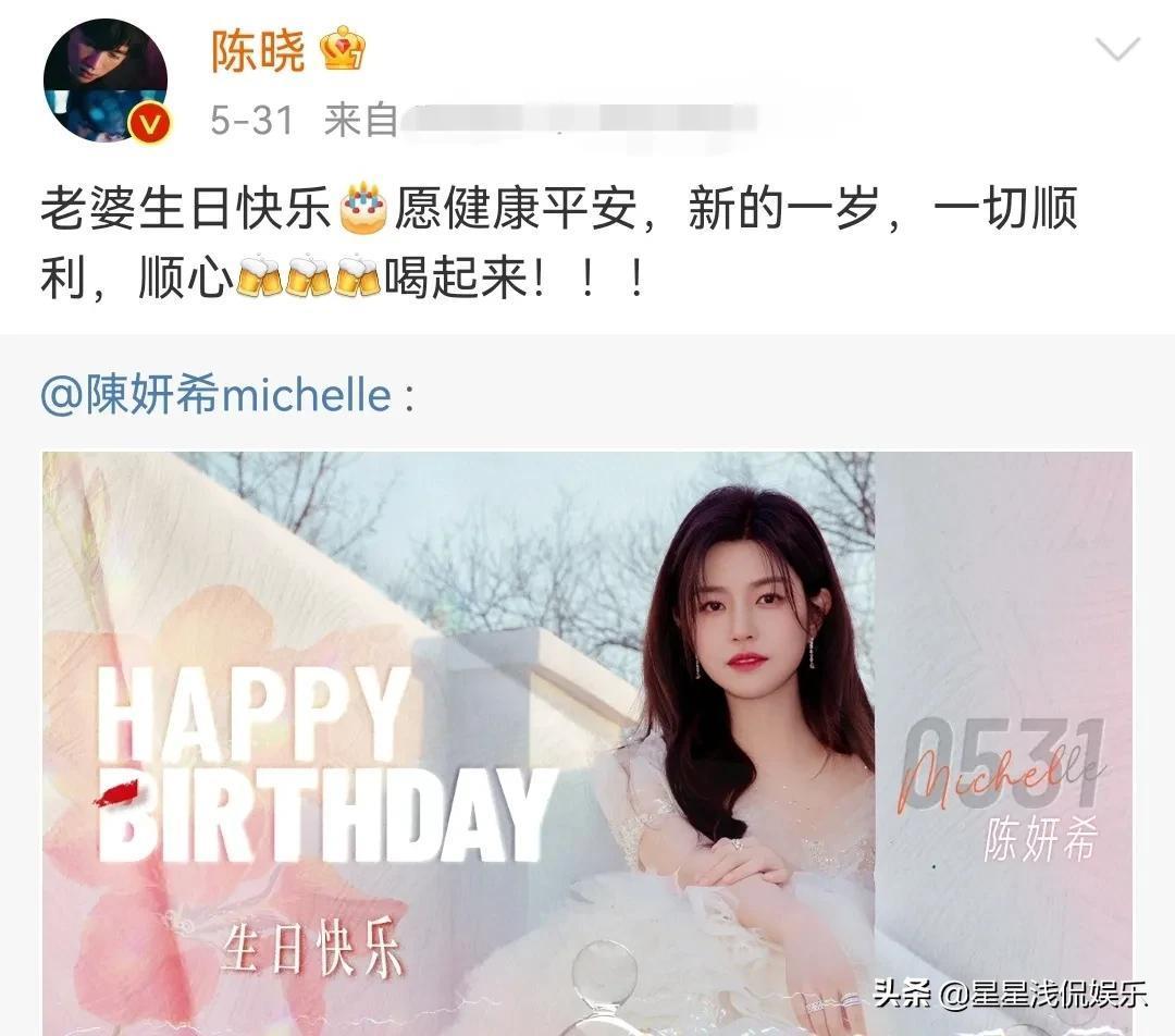 当然了陈妍希也不是单方面的,陈晓也会为陈妍希庆生,前不久的5月31日是陈妍希39岁生日,陈晓也送祝福:老婆生日快乐愿健康平安,新的一岁,一切顺利,顺心[干杯][干杯][干杯]喝起来!