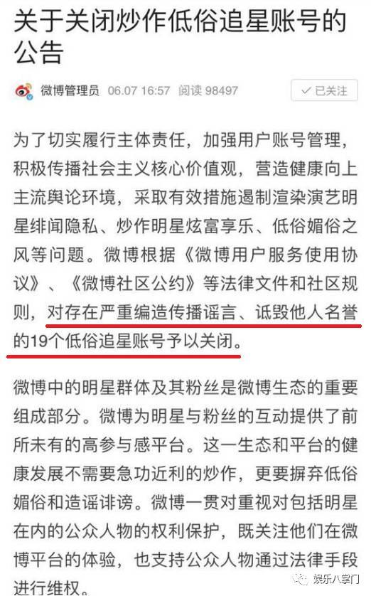 而新浪方面,在封号之后也发布了一篇公告,称关闭了19个低俗追星账号