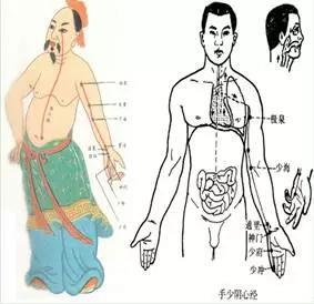 (七)手太阳经别:从手太阳经脉的肩关节部分出,向下入于腋窝,行向心脏,联系小肠。