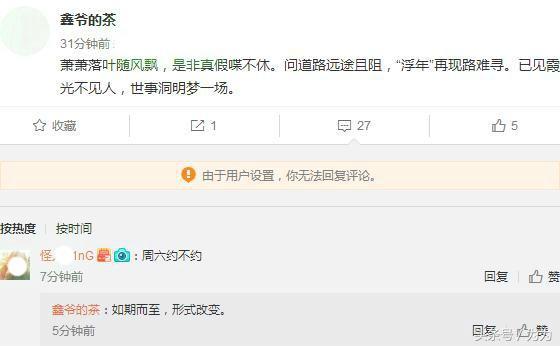 不到一个小时以后,疑似卓伟小号“鑫爷的茶”再发微博,又是赋诗一首,在和网友的互动中,“鑫爷的茶”表示:“如期而至,形式改变。”