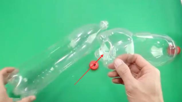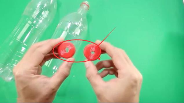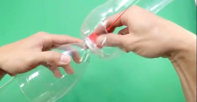 然后将打好圆孔的饮料瓶底部与另一只饮料瓶嘴连接,瓶盖达到了将两个瓶子连接固定的作用外,瓶盖打好的孔也起到了透气的作用。(看到这里我不得不佩服小哥的眼里,套上瓶盖的两个饮料瓶严丝合缝。)