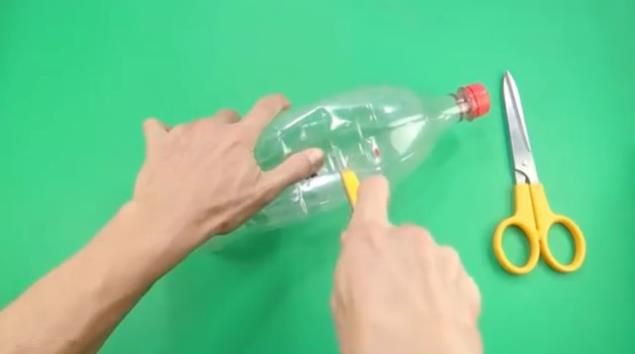 利用美工刀结合剪刀一把,在饮料瓶身约2分之1处切割大小适当的开口,便于后期花草栽种与花草浇水。
