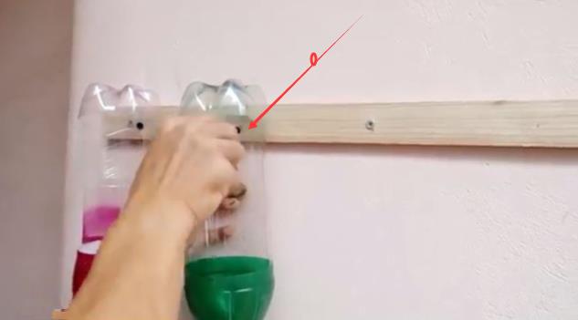 还记得前面瓶底打的孔吗?这时候起到作用了,用钉子将饮料瓶固定在墙上。