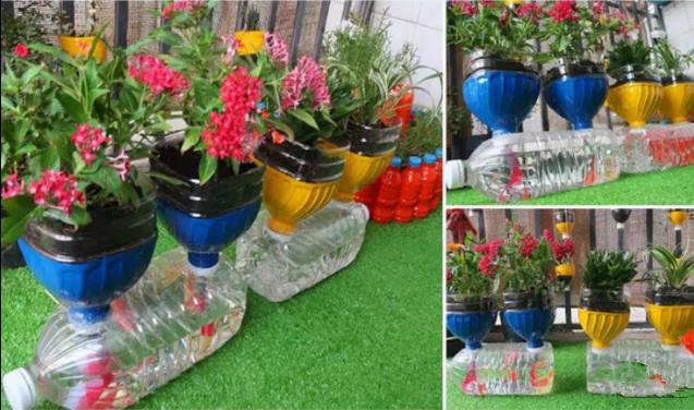 还用塑料油桶搭配饮料瓶,制作出花盆与迷你鱼缸组合。