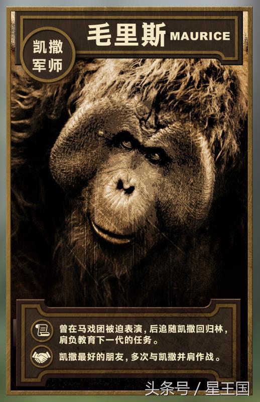 毛里斯,也是凯撒并肩战斗的伙伴。可他表现出来的,则是一种大智慧。尤其在第三部中,他成为凯撒拯救族人的关键性助攻之一。