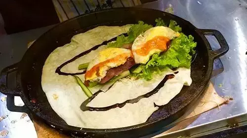 他家主打的就是这种的卷,手撕鸭肉卷挺不错的,垫底的配菜给的也比较多,足足有厚厚的一层,配着各种酱料,吃起来味道比较爽口,不会腻人!