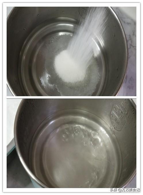 锅中放清水300克,加入白糖70克,开小火搅拌至白糖融化,加热至水开。