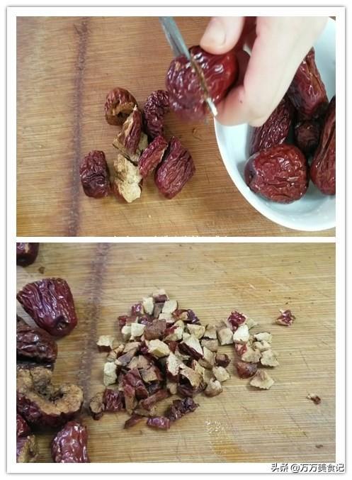 【具体做法】:选择甜度高肉厚的和田大枣100克,洗净后去核,切成小丁。