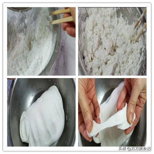 盆中放糯米粉300克澄粉(小麦淀粉)200克,加入煮开的糖水烫面,一边倒一边搅,拌成无干粉的面絮,放至温热,用手抓成团,手上抹点油,揉成光滑细腻的面团,揉好的面团无颗粒无干粉,光滑细腻,像耳垂儿一样柔软。