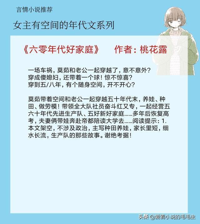 大家好,我是毛毛虫,今天推荐5本女主有空间的年代文宠文,《六零年代好家庭》男女主互动超甜
