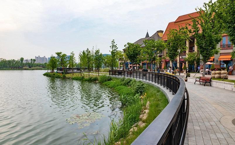 街区临湖而建,湖畔绿道、休憩地、花草等小景营造了一个舒适的空间,整个街区以开放的姿态与周边景观相互掩映,展现了一个简约的时尚空间。