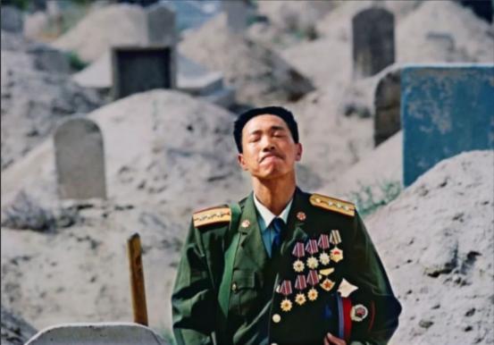 这名军人叫张良善,拍照时他正站在难产而死的亡妻的墓前沉痛悼念。他之所以闭着眼,仰着头,是因为他的眼中满含泪水,但军人的倔强使他不会让泪水轻易流下。