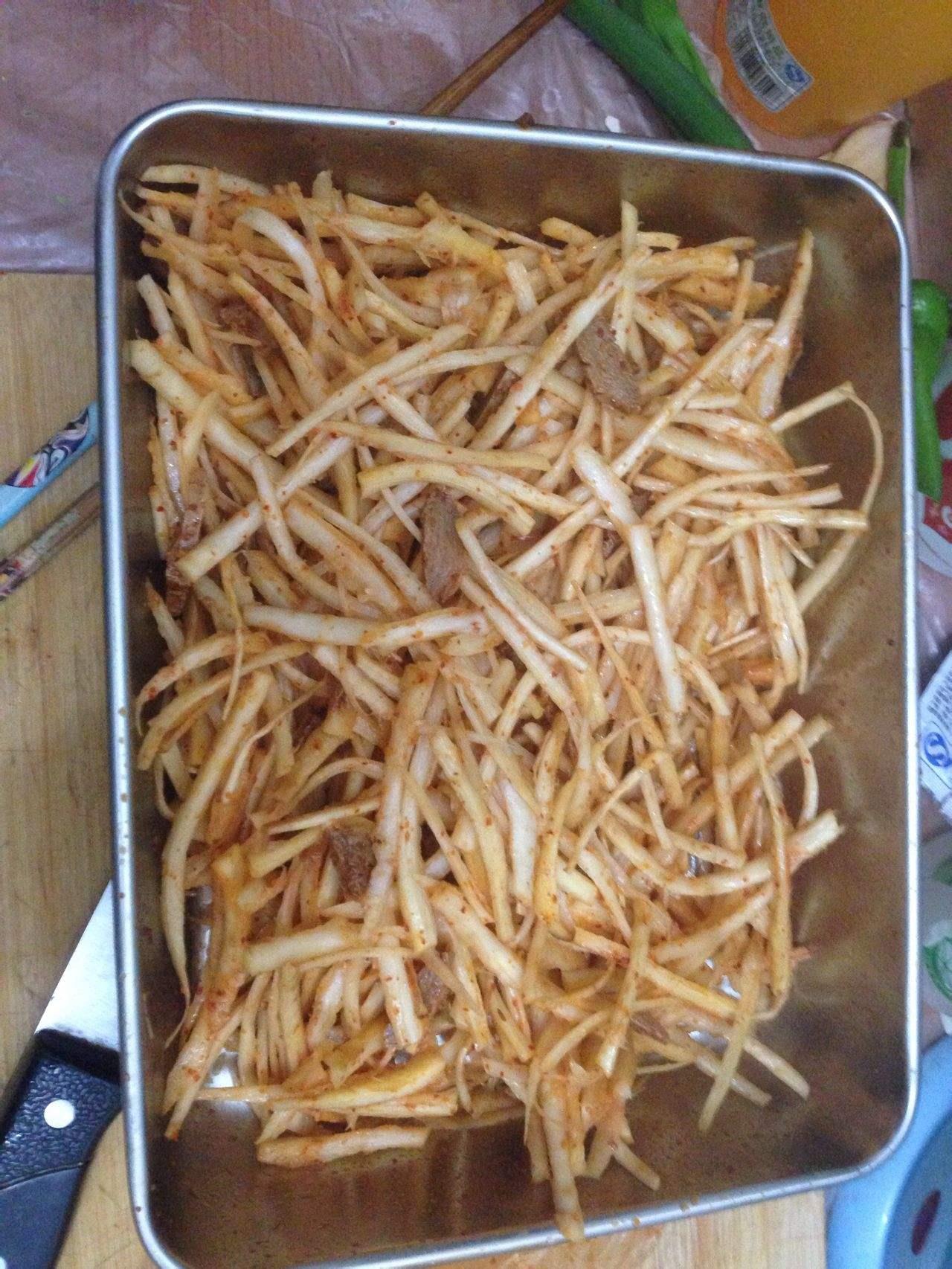 狗宝咸菜做法也很简单,把挖来或买来的桔梗泡上10个小时以上,泡的时间短了口感较硬,然后挑成细条,再泡几个小时解除异味,然后加入盐、味精、辣椒粉拌匀,再撒些芝麻就可以吃了。