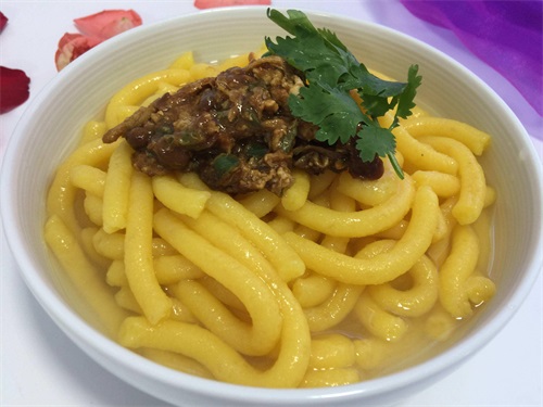 在东北生活过都知道酸汤子,其实炒馇子和酸汤子实质上是一种东西,都是玉米水磨发酵后制成的一种黄色面条状食物,吃起来有点酸,滑溜爽口特别好吃,只是一个是煮,一个是炒。