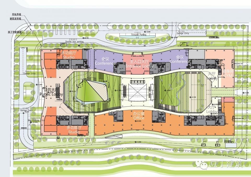 北侧入口为访客的正式及主入口。入口处显眼的大波浪簷篷,作为横线的美丽延续,以建筑语言活泼地点亮设计。进入大楼后,大堂空间延伸至称为“新浪之眼”的主中庭,作为主要垂直交通中心,通过楼梯、扶梯及电梯连接通往各层。与北侧入口大厅相连的是设有多个会议室的会议中心。本层同时设有员工健身中心、休闲室以及公司展示区,可以通向大楼东侧及南侧的室外区域。