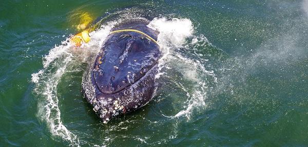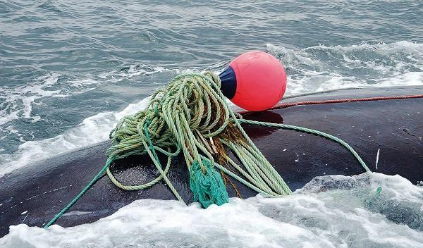 被捕鱼线缠绕的露脊鲸