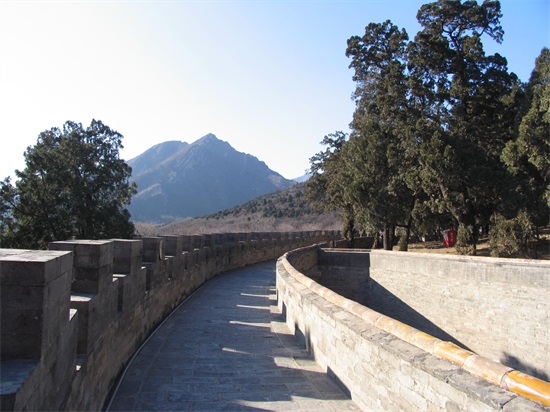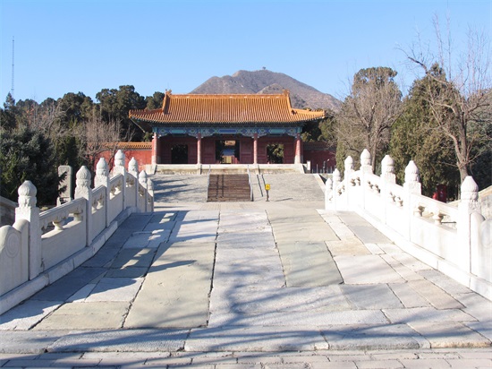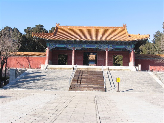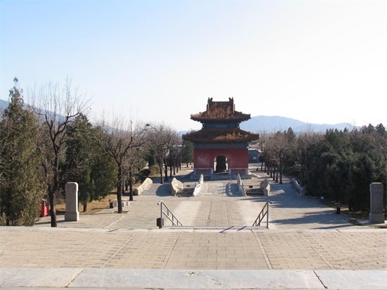 登上明楼,视野开阔,山峦起伏,壮观的陵寝建筑与山谷的美景融为一体,是难得的上风上水之地。沿着宝城马道环绕宝城走上一圈,向远方眺望其他一些陵寝殿宇错落有致地显现在树木与山川之间,金黄色的瓦顶与湛蓝的天空构成了一幅绚丽的画卷。