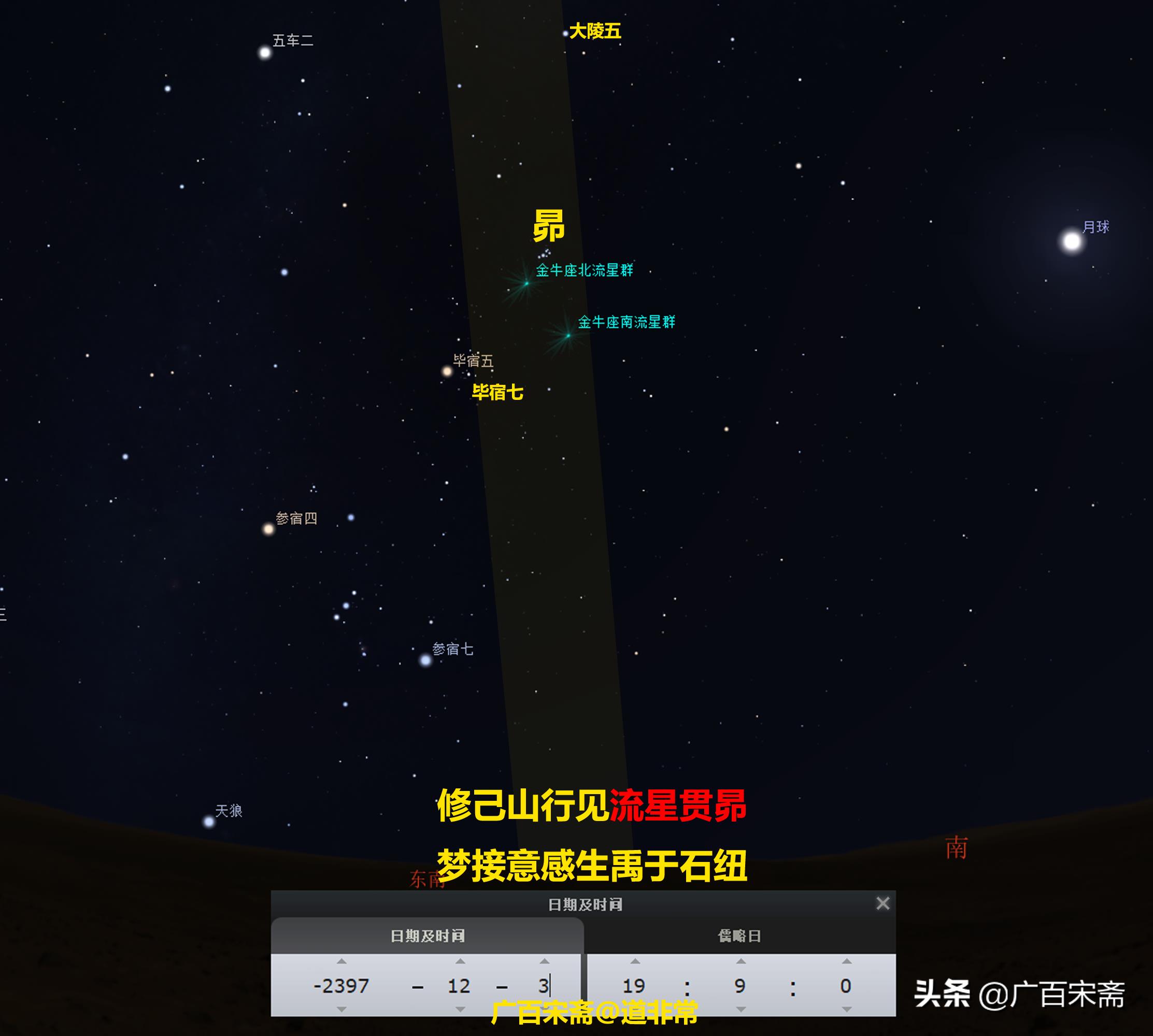 还有人不服?好嘛,继续罗列天文历法证据——文献记载,大禹母亲修己怀孕时,看到流星贯昴,就是流星飞越昴宿天区。