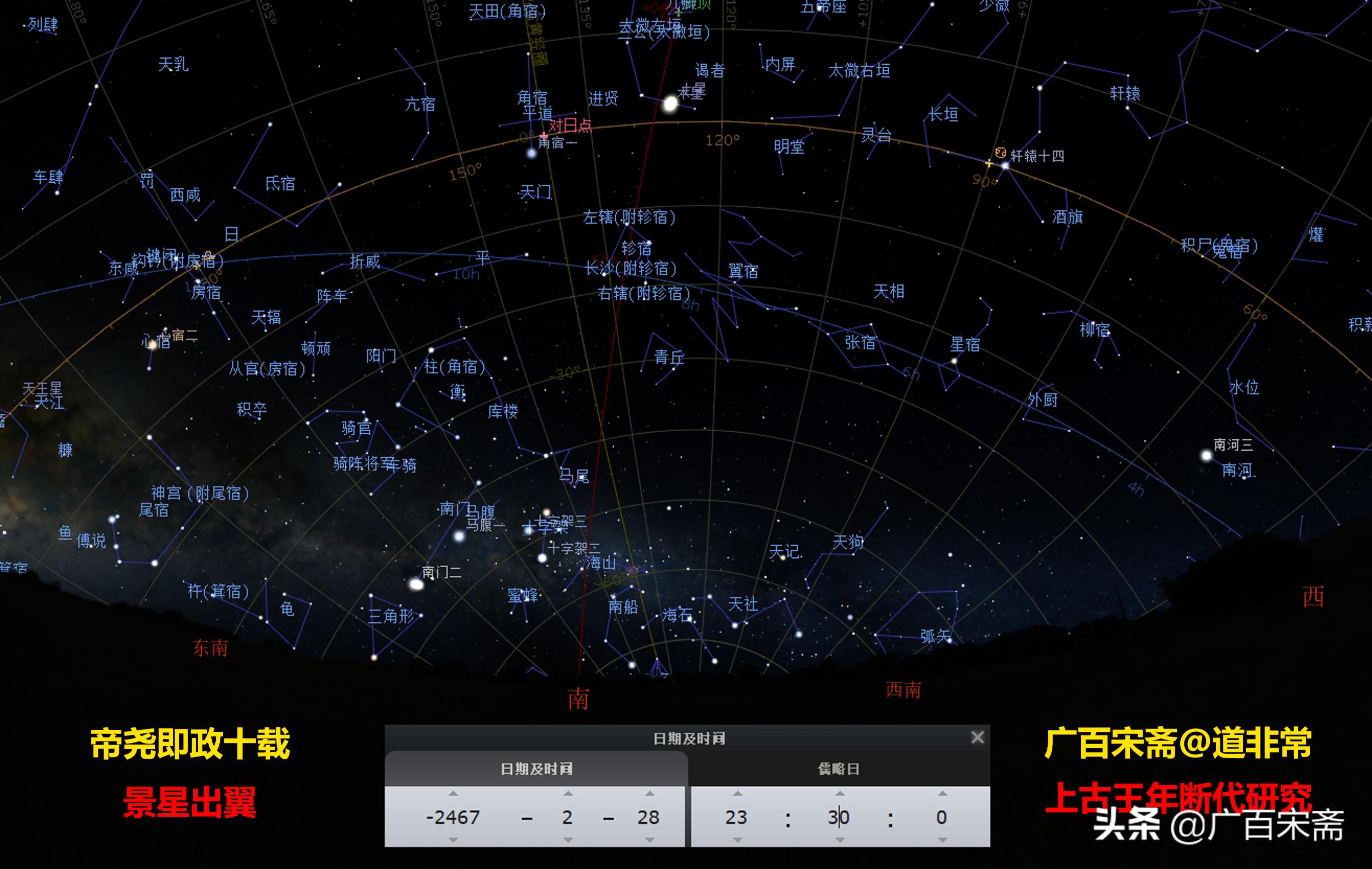 文献又记载,帝尧十年,“景星出翼”——我精确论证,所谓景星就是五大行星出现双星遇合的天象,景星出翼就是双星出现在翼宿。简单嘛,公元前2468年,帝尧十年,正好就出现了土星和木星在翼宿遇合几个月的天象。没有任何人能反驳这一论证。