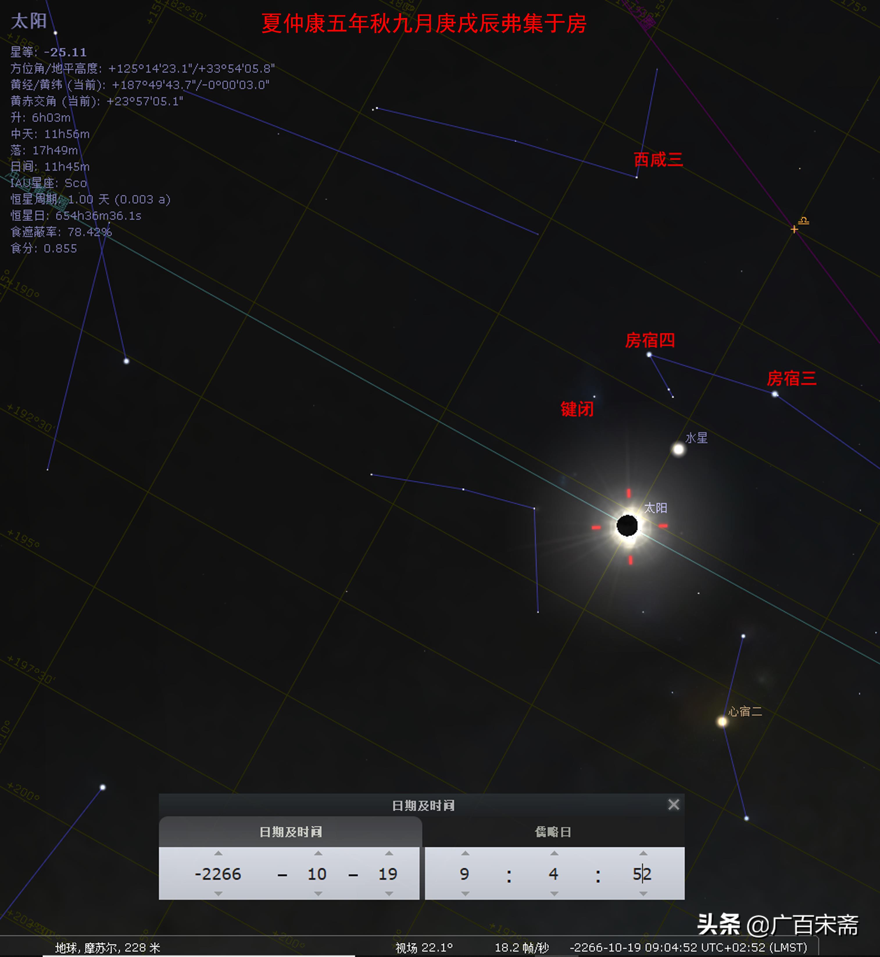 文献又记载,夏仲康秋九月庚戌朔日,发生了日食,“辰弗集于房”,房宿天区发生了日食,几个大辰汇集在房宿天区——日、月、水星、日月合朔,以及其他具有重要指征意义的恒星或行星都是“辰”。这是哪一年?