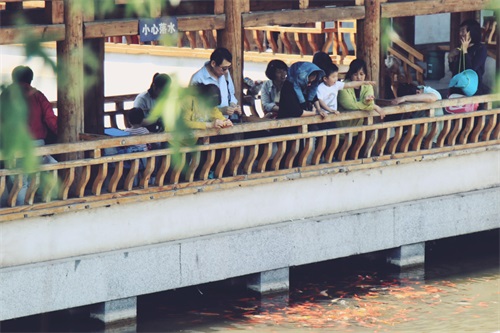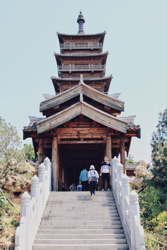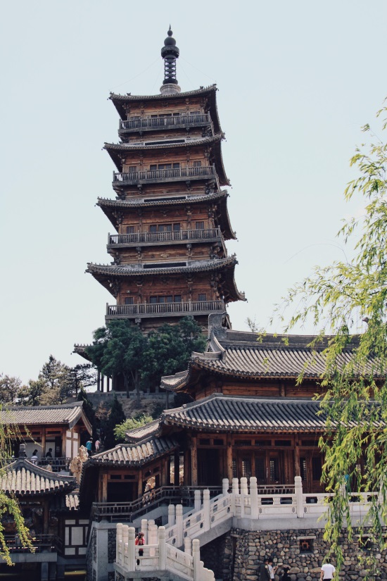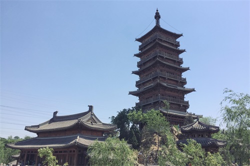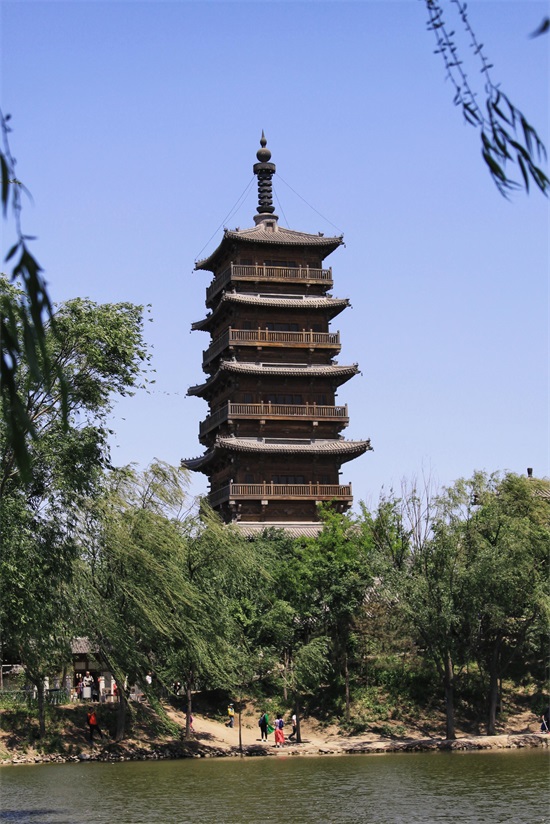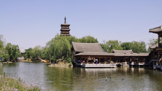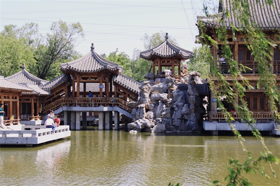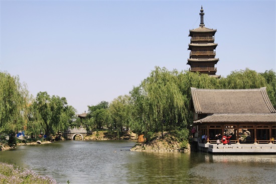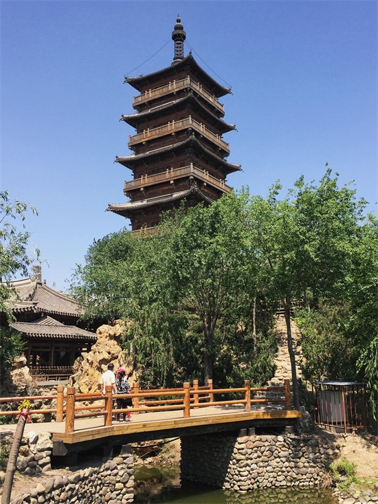 继续往前走没多远,一座石桥搭在小河之上,顺着桥向前看去,亭台楼阁,池水幽幽,廊桥曲折,高高的木塔在阳光的照射下,格外引人注目。