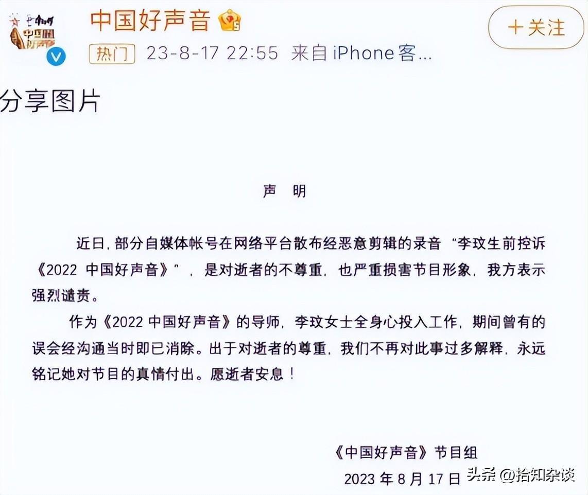 李玟去世后,《好声音》节目组也只是在网络平台发布了一则无关痛痒的声明。