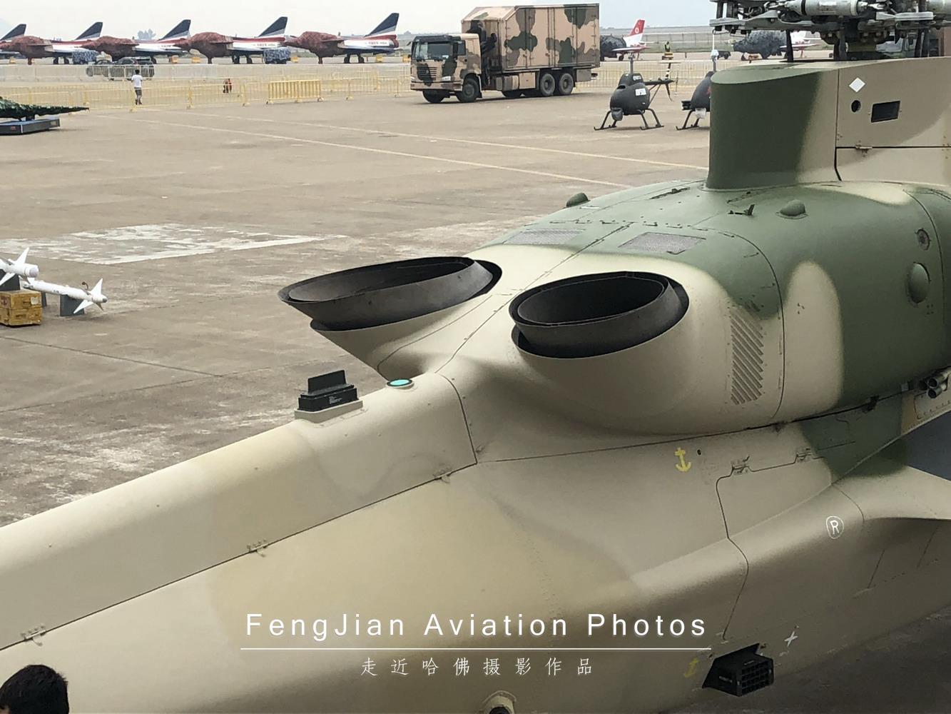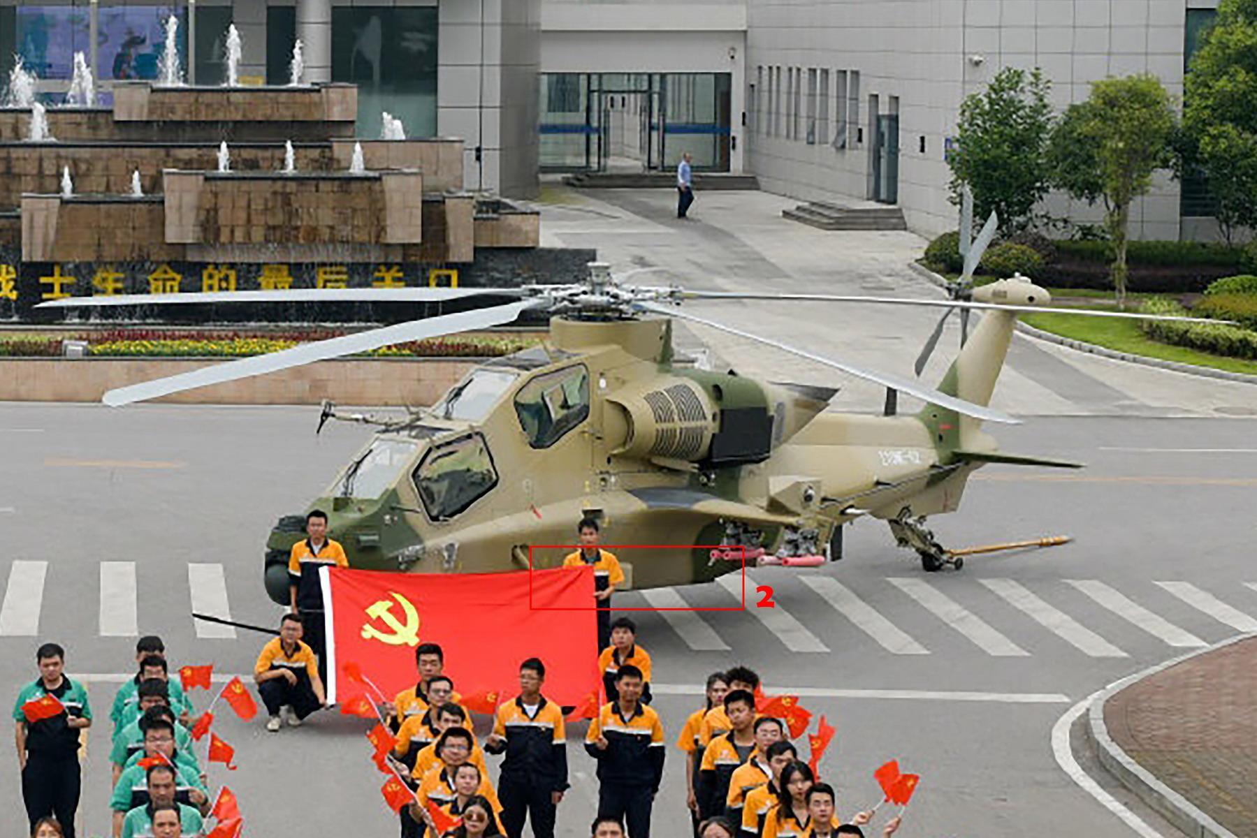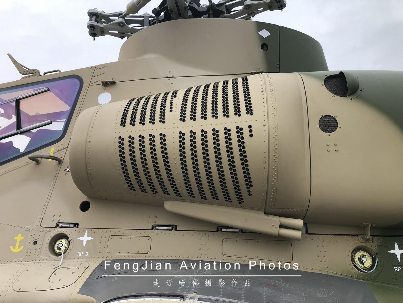 这次随02架机一起公开的国产新型定向红外干扰机,没有采用吊舱的方式悬挂,而是将其作为直升机上的一个固定设备安装在短翼上方。之所以没有安装在短翼翼尖,主要还是考虑不影响武器挂载使用,避免和下方的武器挂架产生冲突。加装了定向红外干扰机的02架机在光电对抗和生存能力方面将有很大提高。