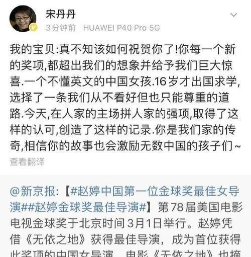 长期居住在美国的赵婷在凭借《无依之地》获得第78届美国电影电视金球奖最佳导演,宋丹丹第一时间表示祝贺。