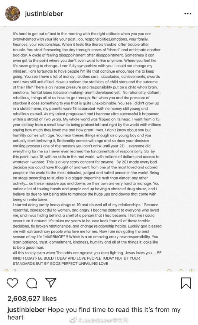 前不久贾斯汀比伯在Instagram上发表了一篇长文,他回顾了自己25年的人生,并对过去荒唐的自己进行了反思。他希望在以后的日子里,自己会做得更好。