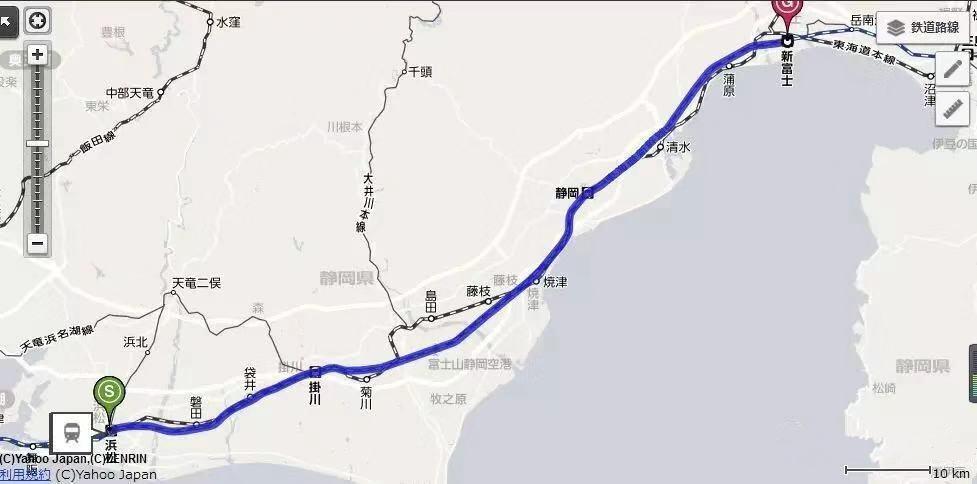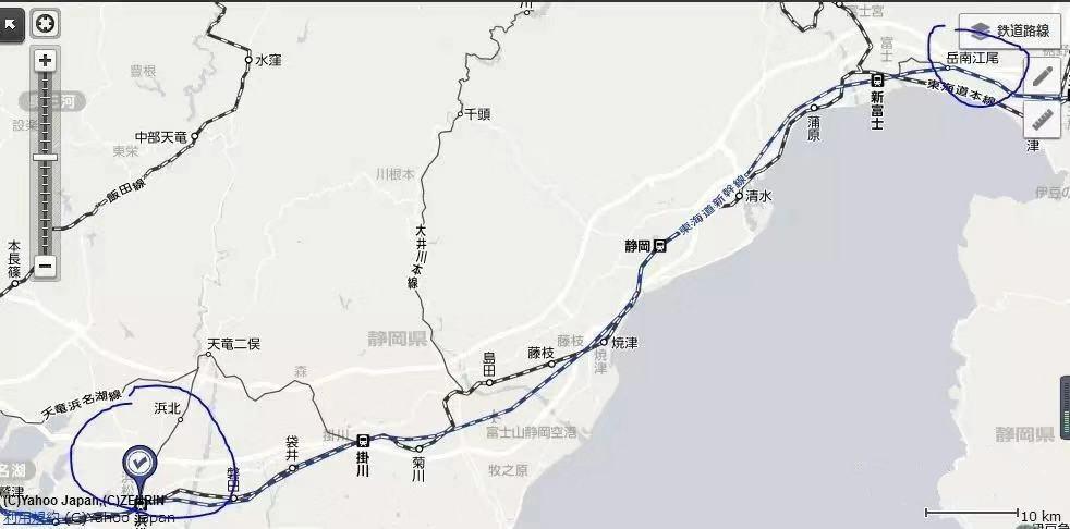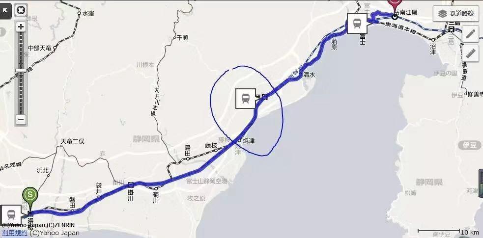 能看到它确实连通了这两个地方,一直从“浜松站”(在新浜松站旁边)通到“新富士站”和“岳南江尾”,在地图上看的话似乎也没啥毛病,新富士站和岳南江尾站确实在比奈附近。那么有没有可能是叶纯坐错了车,上了这条蓝色的新干线,一路开到了比奈那边呢?