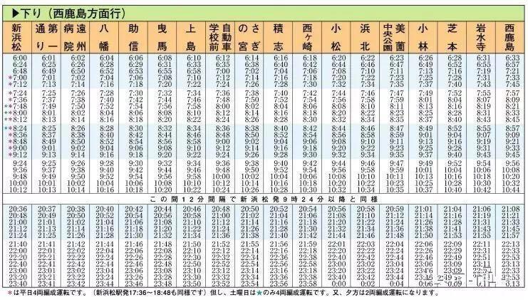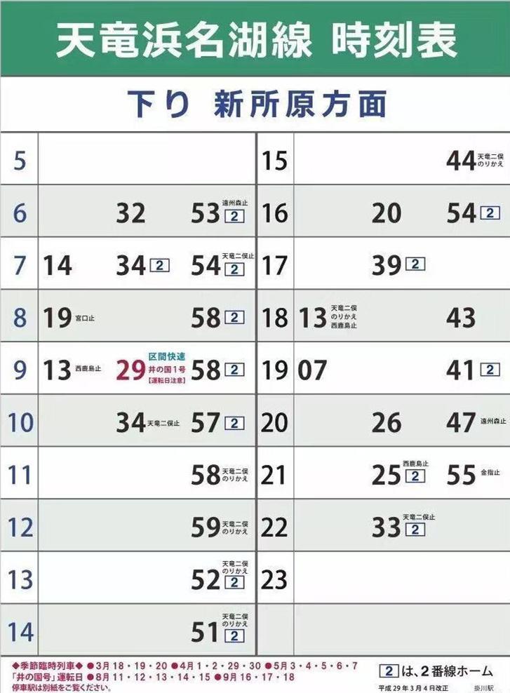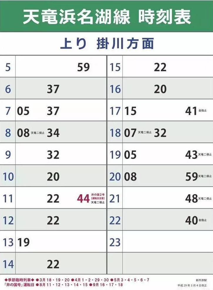 上方横向的那条线是天滨线,中间竖着的是远洲线,两条线相交的地方是远洲线的终点站“西鹿岛站”。乘坐远洲线到西鹿岛就可以坐上天滨线,所以说,天滨线上行驶的电车也可以理解成是从“新浜松站”方向开过来的。虽然这么理解很牵强,但好歹也勉强符合叶纯的描述了。但我们再看天滨线的时刻表,如下。