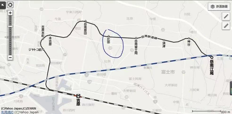 叶纯的故事中,她是在新滨松附近上车,一路开到了如月车站,而如月车站似乎又在比奈附近,这个情况和现实情况完全不符合。可比奈附近其实只有一条铁路线,如上图,就是“岳南铁路线”。但这个岳南线距离远洲线和天滨线太远了,一百多公里,它也开不到新浜松站附近,所以叶纯乘坐的肯定也不是这条“岳南铁路线”。