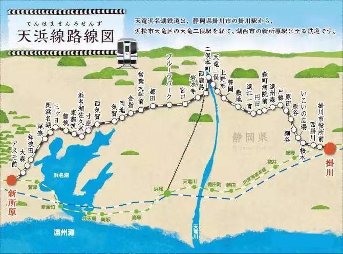 这条线全名叫“天龙滨名湖铁道”,顾名思义,肯定是一条旅游路线。这是一条在山脚下行驶的铁路线,沿途有很多老站台、废弃站台、景点,在环境上是非常符合叶纯当天所坐电车的情况的。但再看远洲线和天滨线的关系,如下。