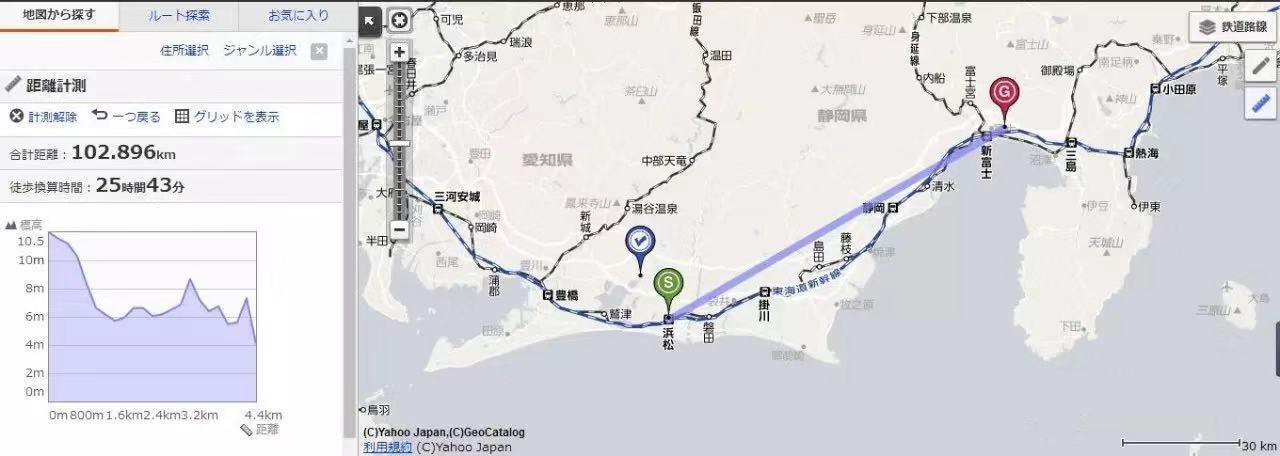 上图中蓝色标签是天滨线的位置,绿色标签是新浜松站的位置,红色标签是比奈。通过这张图可以看得很明白,比奈的距离是非常远的,这计算的还仅仅是直线距离。