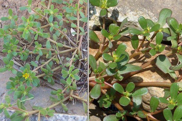 马齿苋(Portulaca oleraceaL.),别称马苋,五行草,长命菜,五方草,瓜子菜,麻绳菜,马齿菜,蚂蚱菜等。一年生草本,叶片扁平,肥厚,似马齿状,上面暗绿色,下面淡绿色或带暗红色。花期5-8月,果期6-9月。中国南北各地均产。全草供药用,有清热利湿、解毒消肿、消炎、止渴、利尿作用;种子明目;还可作兽药和农药;嫩茎叶可作蔬菜,味酸,也是很好的饲料。
