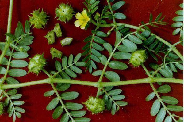 蒺藜(Tribulus terrestrisL.)又名白蒺藜、屈人等。茎平卧,无毛,被长柔毛或长硬毛。全国各地有分布。生于沙地、荒地、山坡、居民点附近等地。青鲜时可做饲料。果入药能平肝明目,散风行血。果刺易粘附家畜毛间,有损皮毛质量。为草场有害植物。