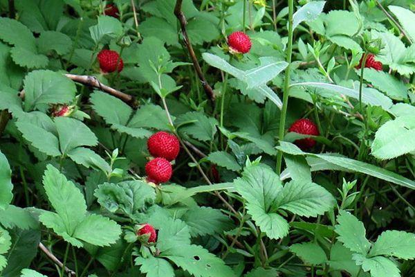 蛇莓(Duchesnea indica(Andr.) Focke),别名蛇泡草、龙吐珠、三爪风、鼻血果果、珠爪、蛇果、鸡冠果、野草莓、蛇藨、地莓、蚕莓、三点红、狮子尾、疗疮药、蛇蛋果、地锦、三匹风、蛇泡草、三皮风、三爪龙、老蛇泡、蛇蓉草、三脚虎、蛇皮藤、蛇八瓣、龙衔珠、小草莓、地杨梅、蛇不见、金蝉草、三叶藨、老蛇刺占、老蛇蔂、龙球草、蛇葡萄、蛇果藤、蛇枕头、蛇含草、蛇盘草、哈哈果、麻蛇果、九龙草、三匹草、蛇婆、蛇龟草、落地杨梅、红顶果、血疔草、野草莓等等。花期6-8月,果期8-10月,果实表皮红色,果肉为白色。全草供药用,有清热解毒、活血散瘀、收敛止血作用,又能治毒蛇咬伤,敷治疔疮等;并用于杀灭蝇蛆。全国各地都有分布。