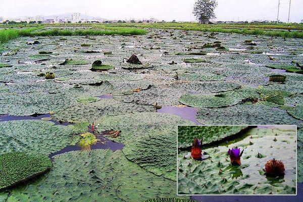 芡(uryale ferox Salisb. ex DC),别称假莲藕、湖南根、肇实、刺莲藕、鸡头米、鸡头莲、鸡头荷、鬼莲。睡莲科,大型一年生水生植物。茎叶都有刺,叶花漂浮水面;叶有沉水和浮水两种,浮水叶大型,径可达1.3米,叶面具刺;红花紫色,花后结浆果,外皮有刺,种子黑色。种子含淀粉,可食用或酿酒。药用为滋补强壮剂。果实叫芡实,亦称“鸡头米”、“鸡头果”,我国南北各省区湖塘沼泽中均有野生江浙一带有栽培。