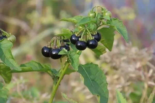 龙葵(Solanum nigrumL. ),别称野辣虎(江苏苏州)、野海椒(四川屏山、南川)、小苦菜(四川会东)、石海椒(四川南川)、野伞子(四川城口)、野海角(四川盐边)、灯龙草(湖北巴东)、山辣椒(河北内邱)、野茄秧(云南蒙自)、小果果(云南河口)、白花菜(广东乐昌、惠阳)、假灯龙草(海南澹县)、地泡子(湖南)、飞天龙(江西)、天茄菜(贵州)、谷奶子(河北唐山)、黑星星(黑龙江)等等。夏季开白色小花,球形浆果,熟后为黑紫色,浆果和叶子均可食用,但叶子含有大量生物碱,须经煮熟后方可解毒。全株入药,可散瘀消肿,清热解毒。几乎全中国均有分布,广泛分布于欧、亚、美洲的温带至热带地区。