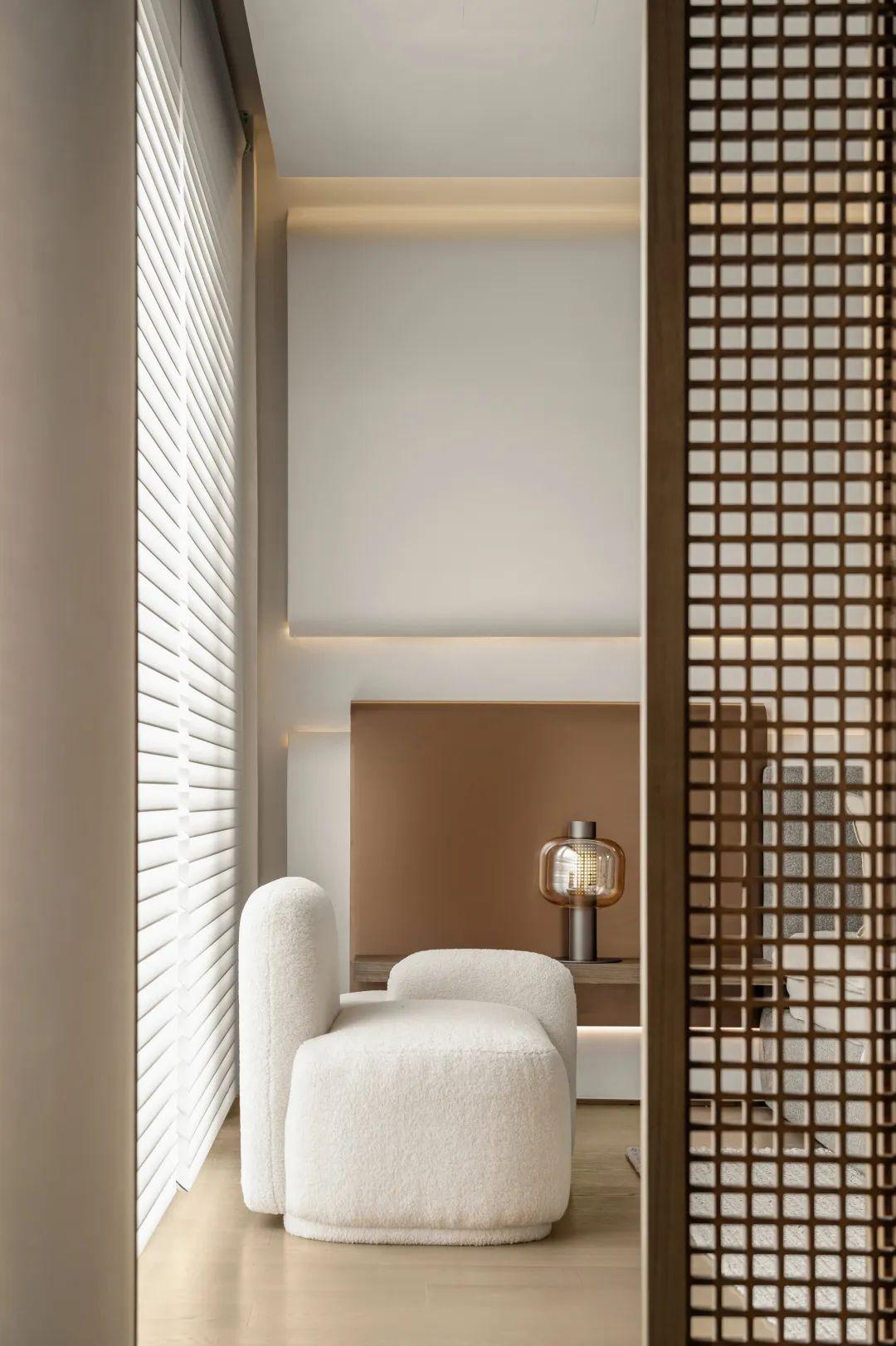 材质运用较温润的软装织品,置入青铜金属材质,让整体更为稳重,天花曲线设计带入禅意流动线条,从天花延伸至墙面,增加空间的跃动韵律。