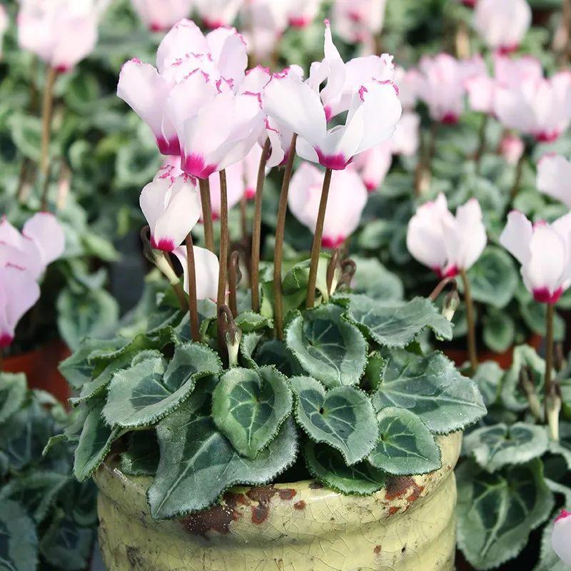 迷你仙客来的品种也有很多,颜色丰富,植株小巧不占用空间,它的花期可以从秋季一直延续到来年的4-5月份,花开不断,