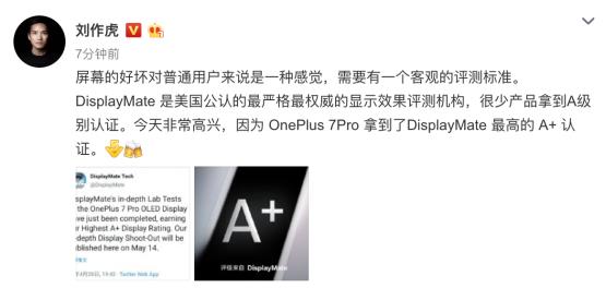 4月29日,一加CEO刘作虎再次曝光新机一加7的相关消息:OnePlus 7 Pro获得权威屏幕测试机构 DisplayMate给出的 A+ 等级评价。此前,刘作虎在微博上表示一加投入了近一亿元人民币的研发费,定制一个专属于一加的、独一无二的显示屏。