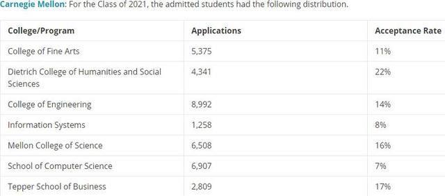当然与专业实力相匹配的,还有CMU令人望而却步的录取率:2021年毕业的这级,平均录取率在13.53%;各学院的自身录取率差别很大,最高的人文社科学院是22%,最低的计算机学院只有7%。升入CMU的学生其高中的平均GPA是3.76